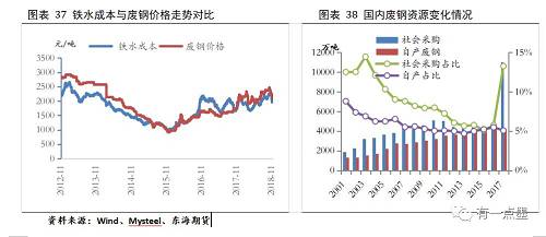 2017年初,国家开始清理“地条钢”,导致大量废钢资源流向市场,废钢价格持续下滑,使得“多吃废钢”较铁水就有经济性。紧接着,国内环保政策开始趋严,高炉限产力度加大,在行业利润高企的情况下,钢厂通过转炉添加废钢的方式提高产量。2017年之后,国内废钢消耗大幅提升,2017年全年转炉废钢单耗为131.06kg/t,同比增加60kg,转炉废钢比13.1%;2018年上半年转炉废钢比达到15%,考虑到近几个月生铁粗钢比值仍在下滑,预计2018年全年转炉废钢比有望达到16%-17%,对于大多数企业而言,转炉废钢比超过20%将会影响冶炼效率,且当下废钢较铁水并不具有成本优势,故预计2019年转炉废钢比的提升空间将极其有限。